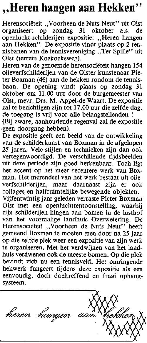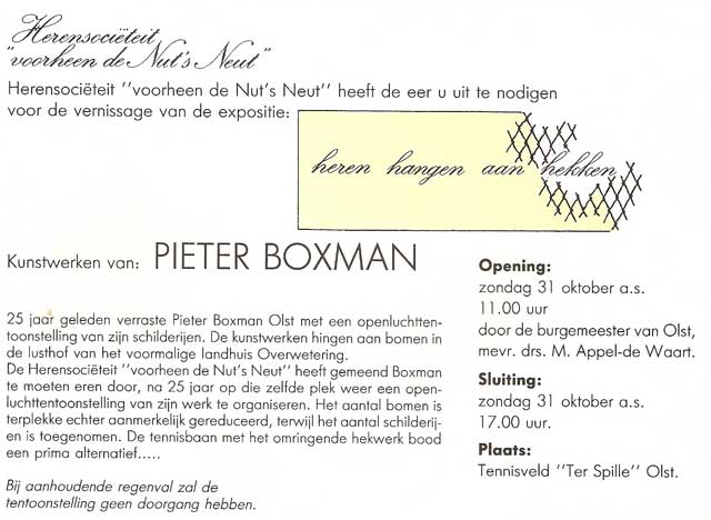 Op 31 oktober 1993 opende burgemeester Marietje Appel de tentoonstelling "Heren hangen aan hekken", een 1-daagse expositie van olieverfschilderijen van Pieter Boxman, lid van het eerste uur van onze soos. Geen reguliere expositie als in een galerie, maar een expositie in de open lucht, aan het hekwerk van tennisvereniging Ter Spille. Leden van de soos organiseerden de dag, hingen 's-morgens de 154 (!) werken op en verwijderden ze aan het einde van de dag. Zo zijn ze dan ook wel weer, die leden. De tennisbanen van Ter Spille zijn aangelegd op de plek waar eerder het landhuis "Overwetering" stond. Pieter exposeerde daar in 1968, waar zijn schilderijen aan bomen waren bevestigd.