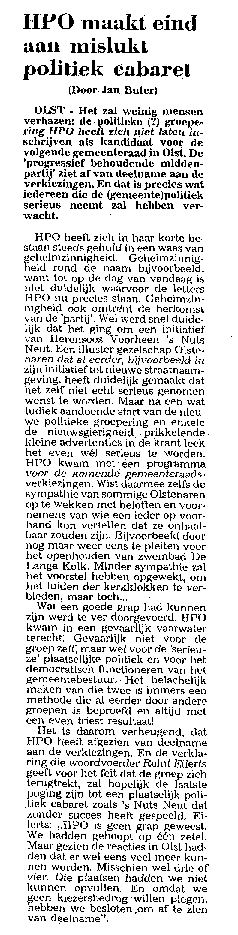 Gemeenteraadsverkiezingen anno 1990. Uit het niets was daar een plaatselijke partij: de HPO. Citaat uit het manifest van de HPO: "De HPO is een behoudend-progressieve middenpartij op grond van levensovertuiging, die zich richt op de belangen van de inwoners van de gehele gemeente Olst. Zonder een dorpspartij als de HPO is de politiek in Olst één grijze brij. De HPO komt op- en maakt zich sterk voor ondernemers, middengroepen en sociaal zwakkeren."