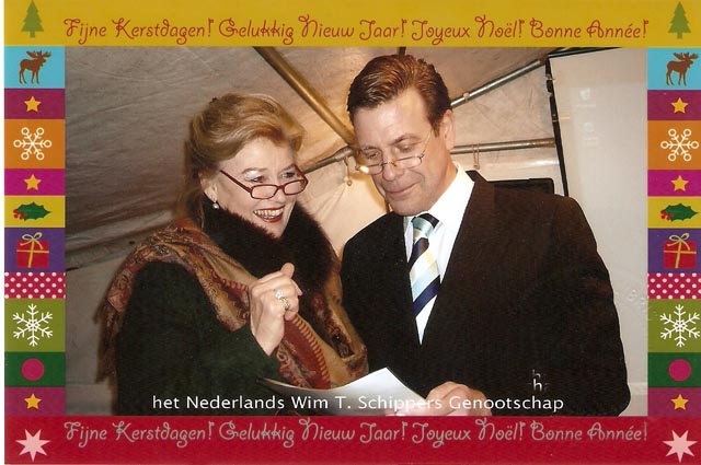 Kerstkaart van het Wim T. Schippers Genootschap 2007 met daarop afgebeeld Willy Dobbe en de Olster burgemeester Ton Strien tijdens de viering van het 10-jarig bestaan van het Willy Dobbeplantsoen.